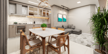 Apartamento 301, 1 suíte + 1 dormitório, varanda com churrasqueira e terraço com área de serviço, sala e cozinha integrada, banheiro social. Vaga de Garagem descoberta (68,13m²)