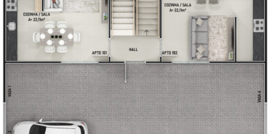 Apartamento 101, 1 suíte + 1 dormitório, sala e cozinha integrada, banheiro social, área de serviço, pátio privativo com Churrasqueira. Vaga Garagem descoberta (60,90 m² + 15,15m² área privativa)