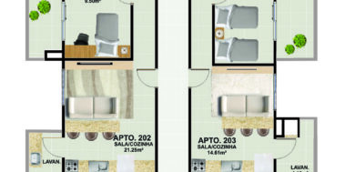 Apartamento 201, 2 dormitórios, terraço, sala e cozinha integrada, banheiro social, área de serviço e Churrasqueira. (64,67m² + 5,6m² terraço)
