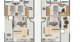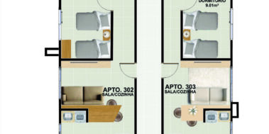 Apartamento 302, 1 dormitório (disponibilidade para 2 dormitórios), sala e cozinha integrada, banheiro social, área de serviço. (51,71 m2)